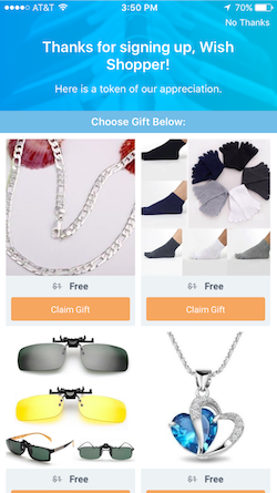 You can also use your onboarding to incentivize first time app users, like a discount for their first purchase. Wish actually gives users a free gift for installing the app as part of their onboarding experience, that rewards the user and builds brand affinity, as a result.