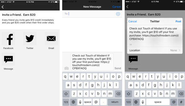 Touch of Modern does this well, offering all the native sharing options a user would expect, making it easy to refer and invite friends.