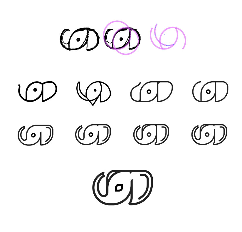 Next, we began the ideation process. At this stage, we created several lo-fi sketches based on the outcome of the creative search session with the team. To get things rolling we also created a list of values and terms associated with the design team. We found ourselves focusing on the term "User-Centered Design". We started working with the shapes of the first letter of each word (U, C and D) and quickly found ourselves with an elephant. Excitement took over as we started seeing the connection of the elephant and other values we had written, values such as curiosity, collaboration, creativity.