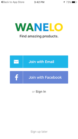 You can also offer a much less prominent option to skip sign-up, like Wanelo does, below— in case a user just wants to quickly see what products you sell— with an upsell for more value when you sign-up later in the app.
