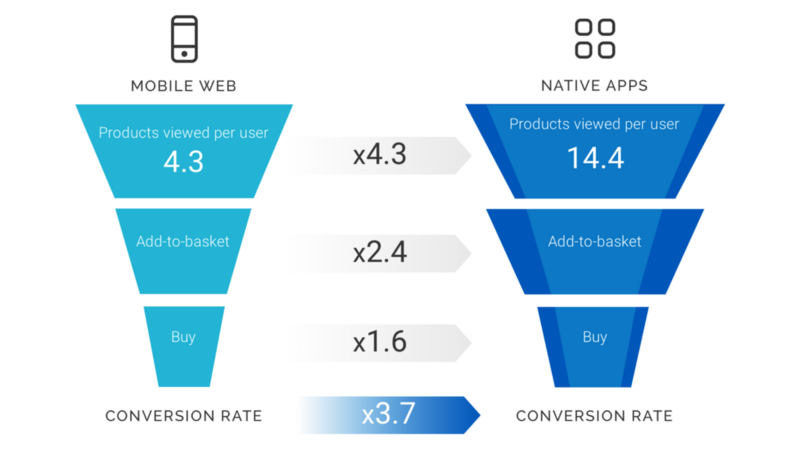 And there's no end in sight: mobile commerce is projected to reach $149 billion in volume in the U.S. alone by 2019. What's more, people purchase in and prefer apps over mobile web. Criteo found that, when compared to mobile web, people view four times the products on average in an app and convert to purchase at a rate 23% higher than mobile web.