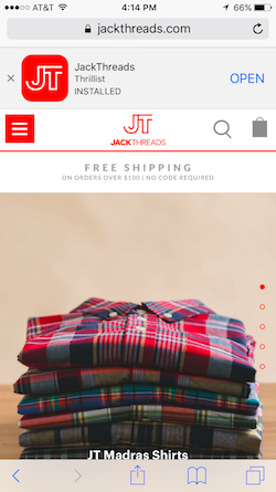 Once set up, people will be given the option to view your app in the App Store, or open it, if it's already installed. JackThreads uses this to ensure their customers are given the option to shop in app, when landing on their site: