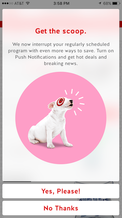 To ensure you are able to get the full reach of this channel, though, make sure you add context as to why you're asking for push permissions. Without this, the user is inclined to opt out; in fact, while 86% of Android users opt-in to push, only 51% of iOS users do. Target's Cartwheel app is a great example of educating your customers before asking for device permissions: