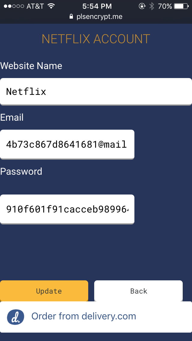 In the Crypt dashboard, you can add each of your account logins. Crypt will then programmatically create a unique, hacker proof email and password for you to use for each of these particular accounts. Crypt takes it a step further by identifying particular organizations and apps it's managing passwords for and provides actionable Buttons for each of these. For example, if Crypt is managing your Netflix account, a Delivery.com Button will appear on the page that houses this account login, because, you know, you might want to get some food delivered when binge watching on Netflix. For your .edu account, a Resy Button will appear for you to book a reservation at one of your favorite restaurants around campus. If it detects an AMC account, an Uber button will show so you can easily book transportation to a film you want to see. If it detects it's managing a password for your Chase bank account, a Jet.com Button will appear for you to make purchases with all that money in your account.