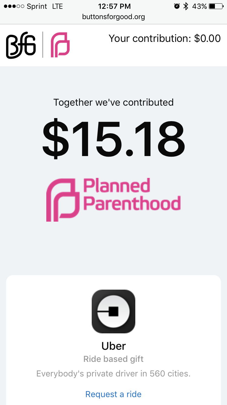 Buttons for Good is a mobile website that allows users to make purchases through Uber, Delivery.com, Spring, Hotels.com, Jet, and Resy using Button's technology, and any commissions earned by Button will be donated to Planned Parenthood. The site is live, so you can check it out and use it at buttonsforgood.org. You can even see in real-time how much total has been contributed and how much of that you have personally contributed!