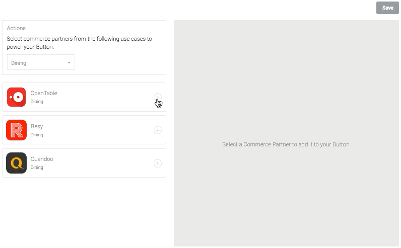 Here's an example: If you select the OpenTable Button and select the Nearby User mode, the Button will display a list of restaurants near the user's location. Alternatively, you can use Nearby Destination to show restaurants where your user is going or Venue mode to display a particular restaurant. Using these options, you can optimize your Button to provide the most relevant experience for your site or app.
