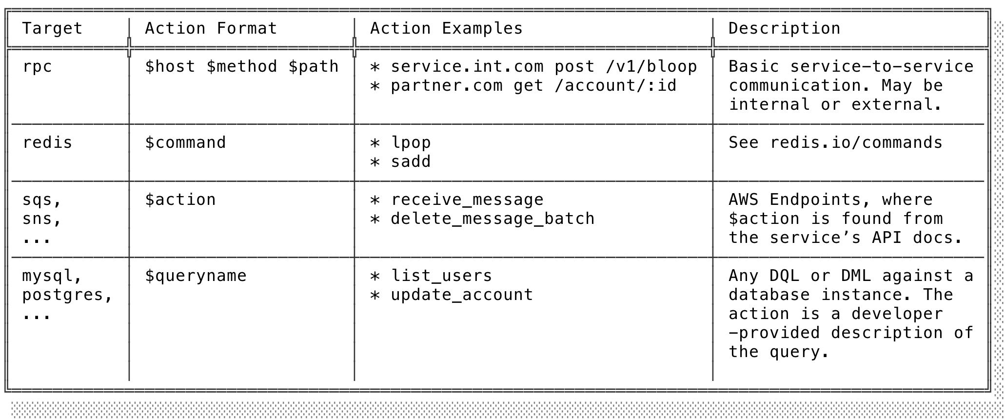 It's never a bad idea as a company to have a standard library of sorts, specific to the needs of your team. Such a library is a suitable home for a general purpose "rpc call" module that can conveniently package all this (and more!) behind an interface that asks little more of the typical developer. isTransient can assume a default implementation appropriate to most rpc calls, target is implicit to the interface, and since a developer will likely need to specify the hostname, method, and pathname of an http request anyways, they get action for free. The same trick can be applied to any other operation; most folks will never need to sweat all this instrumentation and categorization happening behind-the-scenes.