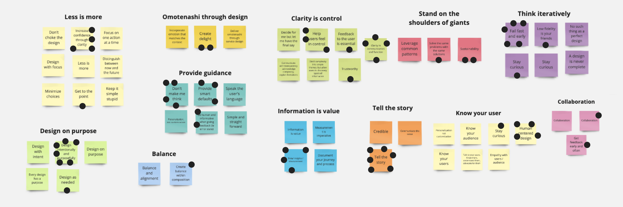 After voting, it became clear where the team was leaning. Again, we began to group stickies that had similar sentiments to create a fuller picture of what the principle encompassed. We wanted each principle to be full, clear, and actionable. When talking through the most voted-on principles we were able to use those less voted-on ones to act as supportive content to communicate the "why"